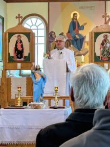 The opening of the retreat actually occurs in a public manner with the clergy gathering at the local parish of the Dormition of the Mother of God where a Moleben’ is prayed and the retreat master preaches his first talk of the week. Bishop Paul Chomnycky, OSBM of Ukrainian Catholic Eparchy of Stamford Connecticut agreed to lead the retreat this year. He shared with the people a great deal of additional insights about the Myrrh-bearers and their encounter at the empty tomb of Christ. The moleben’ was to the Martyrs of Pratulyn. Following the moleben’, Bishop Paul also anointed the congregation while local Bishop, Michael Kwiatkowski presented the relics of the Pratulyn Martyrs for veneration. The parish then hosted the clergy and all the other guests to an amazing lasagna supper in the parish hall.